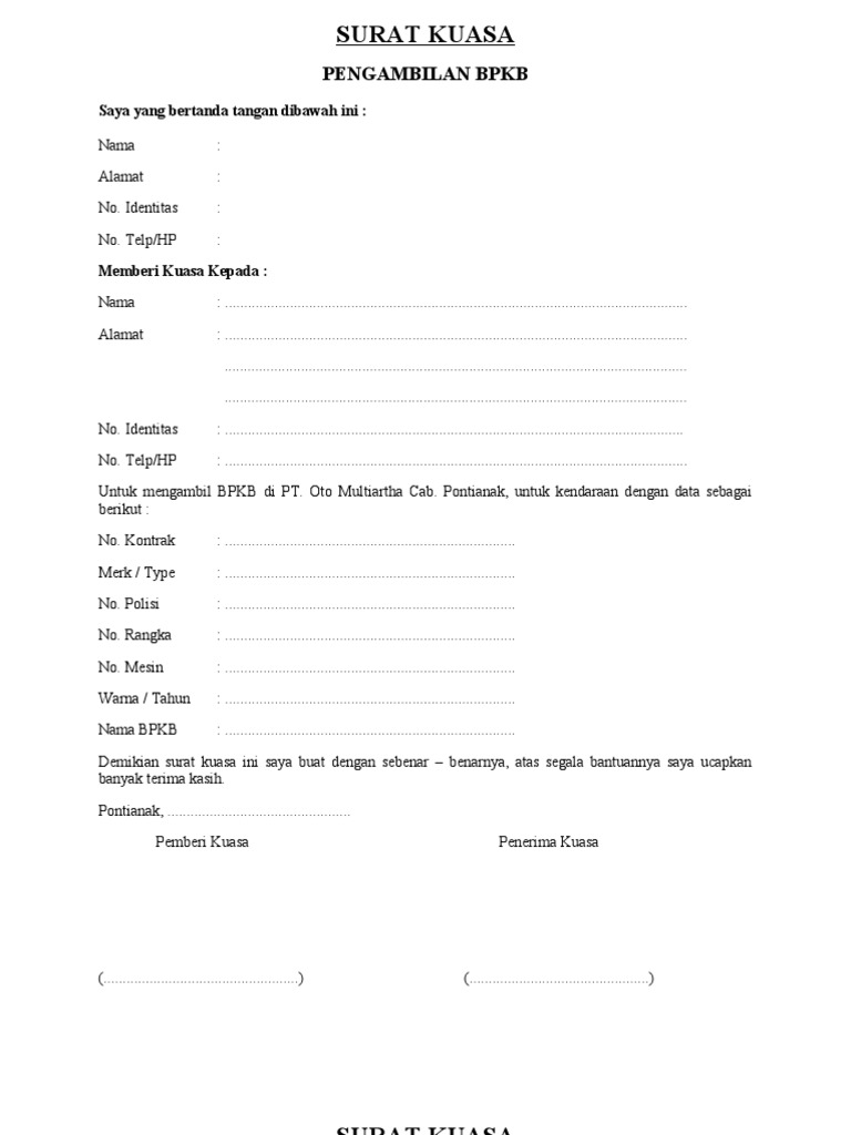 Berkas dan dokumen yang harus di persiapkan. Namun, dalam beberapa kondisi pemilik kendaraan yang berhak atas dokumen ini tidak bisa mengambilnya secara langsung, sehingga pengambilan bpkb harus diwakilkan oleh orang lain. Bagi anda yang menghendaki menyimpan contoh surat kuasa dalam format pdf anda bisa mendownload nya pada link di bawah ini. Savesave contoh surat kuasa pengambilan dokumen for later. Seperti saat seseorang ingin mengambil uang di bank, karena pengambilan uang di bank harus orang yang mempunyai rekening maka orang lain tidak bisa mengambilnya. Bank central asia, tbk dari segala tuntutan/gugatan hukum berupa apapun dan dari pihak manapun juga sehubungan dengan pemberian kuasa dari penarikan tabungan tersebut. Untuk mengurus pengambilan ijazah asli pemberi kuasa beserta kelengkapan tanda kelulusan lainnya yang dikeluarkan oleh institut agama islam negeri (iain) pontianak. Syarat pengambilan bpkb dikuasakan di baf. Contoh surat kuasa pengambilan bkpb motor di leasing. Semoga saja apa yang kami paparkan beserta dokumen yang kami berikan tersebut dapat berguna. Pada surat kuasa pengambilan gaji ini terdapat dua macam. Download as pdf, txt or read online from scribd. Contoh surat kuasa pengambilan bpkb.